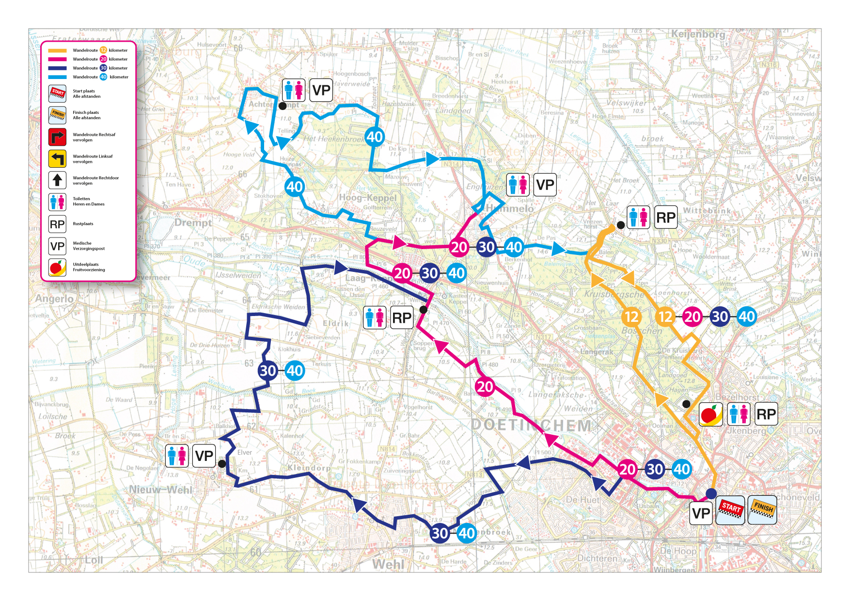 Startpunt van het evenement is het centrum (Simonsplein) van Doetinchem, waar ook dit jaar weer duizenden deelnemers verzamelen om routes van ca. 12, 20, 30 en 40 kilometer door de mooiste delen van de Achterhoek te wandelen.