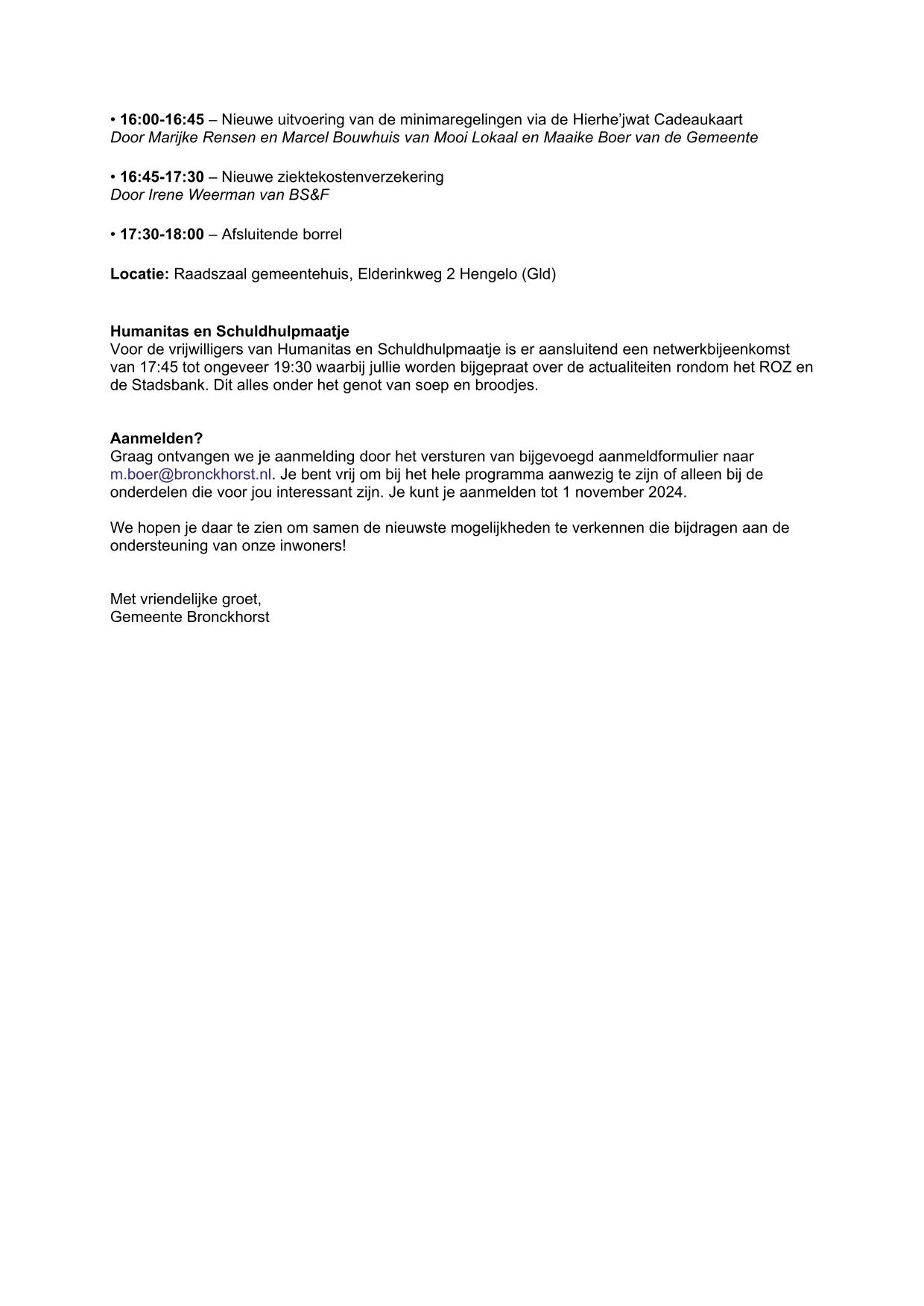 Aanmelden tot 1 november via e-mail m.boer@bronckhorst.nl