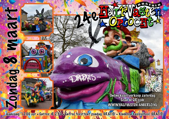 Voor meer informatie en/of aanmeldingen voor de Halfvastenoptocht van zondag 08 maart 2025 zie de website www.halfvasten-angerlo.nl.
