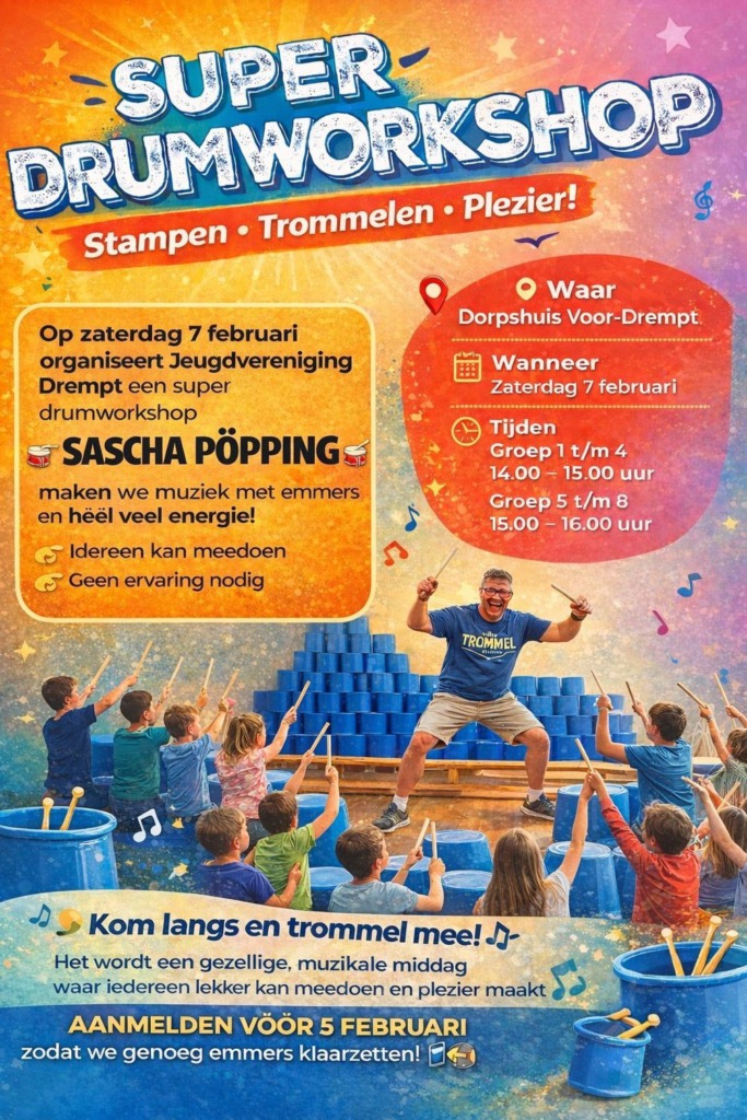 Activiteiten 7 februari 202616 januari 2026 Workshop Percussie Jeugdvereniging za 07feb2026 locatie: Dorpshuis Dremptadres: Kerkstraat 89, 6996 AG Drempttijd: 14:00 - 16:00 uur * Info: jeugdvereniging.drempt@gmail.com ( ga terug naar het evenementenoverzicht )Deze pagina delen met je vrienden ...