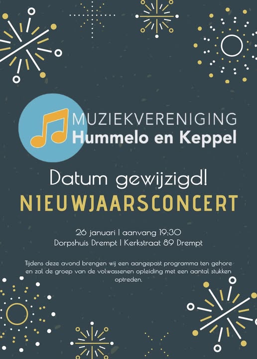 Het Nieuwjaarsconcert van Muziekvereniging Hummelo en Keppel was gepland op 10 januari in Hummelo, maar dat kon vanwege de weersomstandigheden geen dooorgang vinden. De vereniging wil donateurs en andere belangstellenden alsnog een muzikale avond aanbieden en organiseert daarom op maandag 26 januari een miniconcert in het Dorpshuis aan de Kerkstraat 89 in Voor-Drempt. Aanvang 19.30 uur.