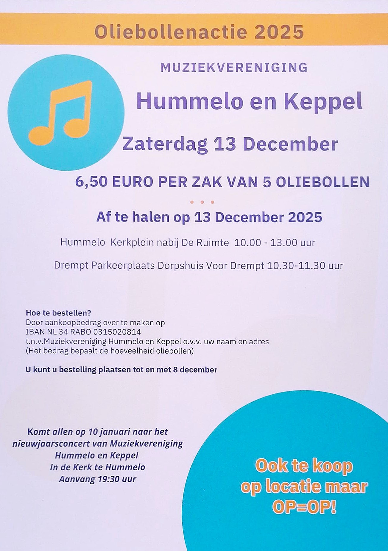 U voldoet uw bestelling door een bankbetaling te doen (het bedrag bepaalt het aantal oliebollen) t.n.v. Muziekvereniging Hummelo en Keppel, IBAN NL34 RABO 0315 0208 14. Vermeld bij de omschrijving uw naam en adres.