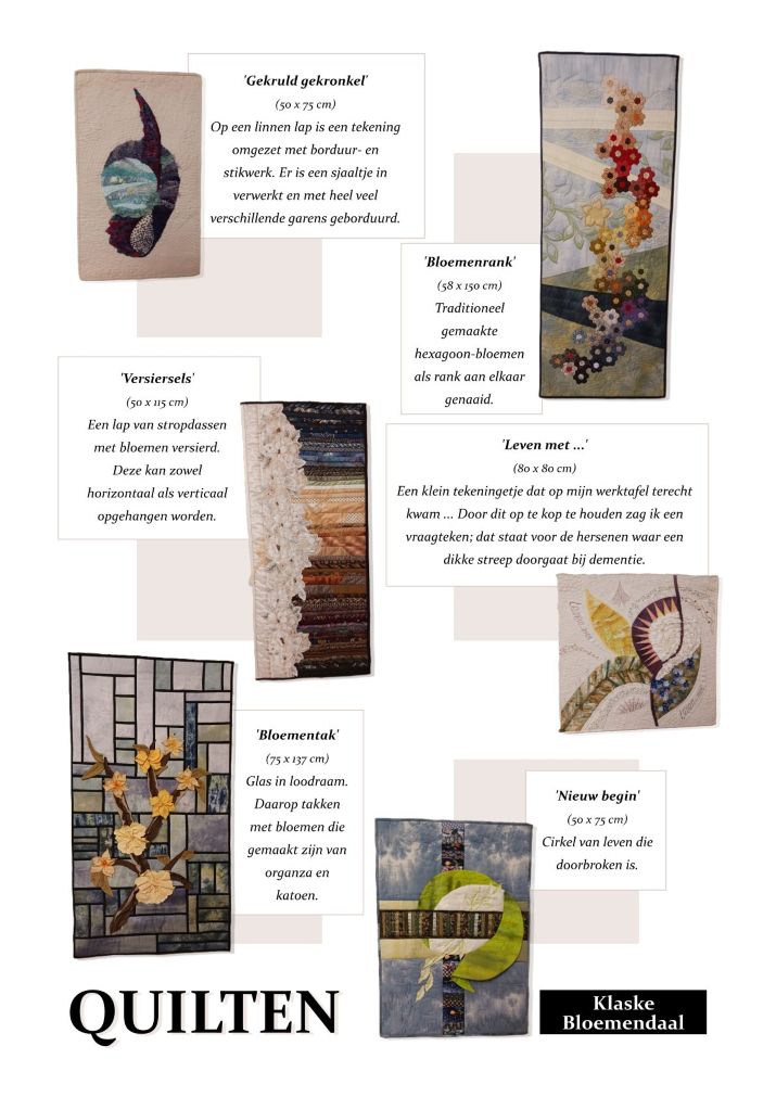 Het textielweekend biedt een gevarieerd en inspirerend overzicht van hedendaags textielwerk en de eindeloze mogelijkheden van werkvormen en materiaal. Daarnaast zijn er drie workshops waarin deelnemers zelf aan de slag kunnen. Zaterdagmiddag kun je met Evelien Kooymans en Bea Hoogland je eigen textielboekje maken. Zondagocchtend geven Aleid te Grotenhuis en Margriet van de Kracht een (gratis) kinderworkshop speciaal voor Moederdag en ’s middags kun je schuren en borduren met Agnes Mc. Daniel en Janny Vermaat.